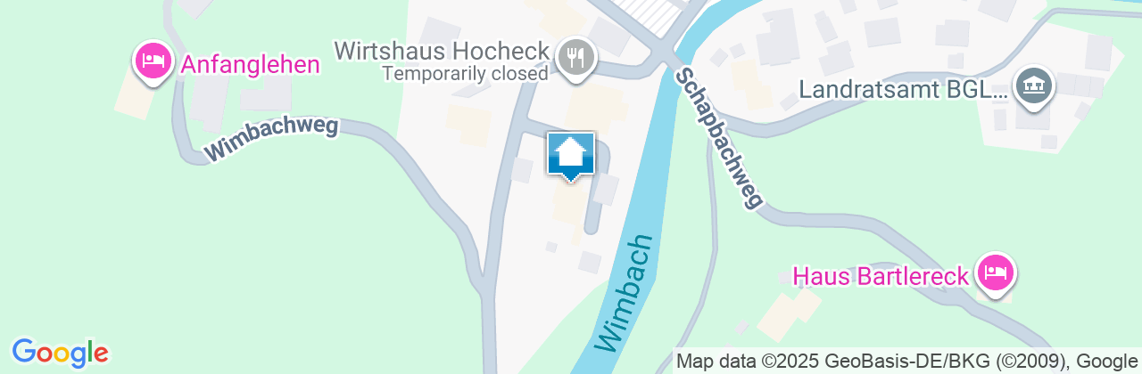 Autobahn A 8 München / Salzburg bis Ausfahrt Bad Reichenhall, weiter auf der B 20 über Bayrisch Gmain, Bischofswiesen,Richtung Ramsau. Nach dem Felsentunnel nächste Abzweigung links, über die Wimbachbrücke, geradeaus, nach dem Gasthof Hocheck befinden wir uns auf der linken Seite.